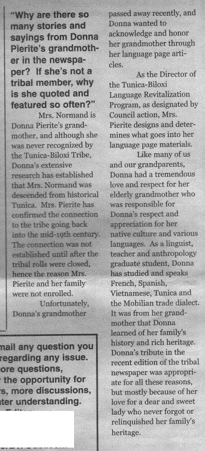 Our project has been featured in the news. Here are some clippings from newspapers regarding our project. 06-15-2003 "News from the Tunica-Biloxi Tribe of Louisiana" March/April 2003, Volume 7, No. 2 Praise for Donna M. Pierite's project and a statement of her credentials� |