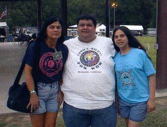 2002 Tunica-Biloxi Pow-Wow Donna and Elisabeth pose with John Barbry (founder of the Tunica-Biloxi Annual Pow-Wow.) Donna is wearing the T-Shirt from the Fête Du Blé, the former Tunica-Biloxi Corn Festival. John is wearing the T-Shirt for the 2002 Pow-Wow. Elisabeth is wearing the T-Shirt for the Choctaw Indian Fair, at which she represented our tribe.