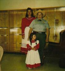 Fête Du Blé circa 1993: Donna and four year old Elisabeth pose with great Aunt Rose Pierite White inside the former Tunica-Biloxi Museum. Rose White was park ranger and museum docent. Donna and Elisabeth are wearing traditional Tunica dresses made by Mary Barbry Vercher, sister of Earl Barbry, Sr.