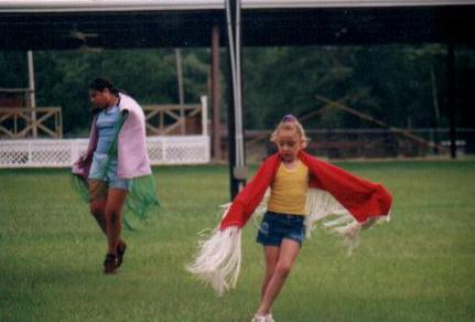 Elisabeth Pierite demonstrates fancy shawl dancing at the Tunica-Biloxi Youth Camp 2003. With Elisabeth is Little Princess Chelsea Williams.