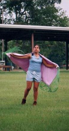 Elisabeth Pierite demonstrates fancy shawl dancing at the Tunica-Biloxi Youth Camp 2003.